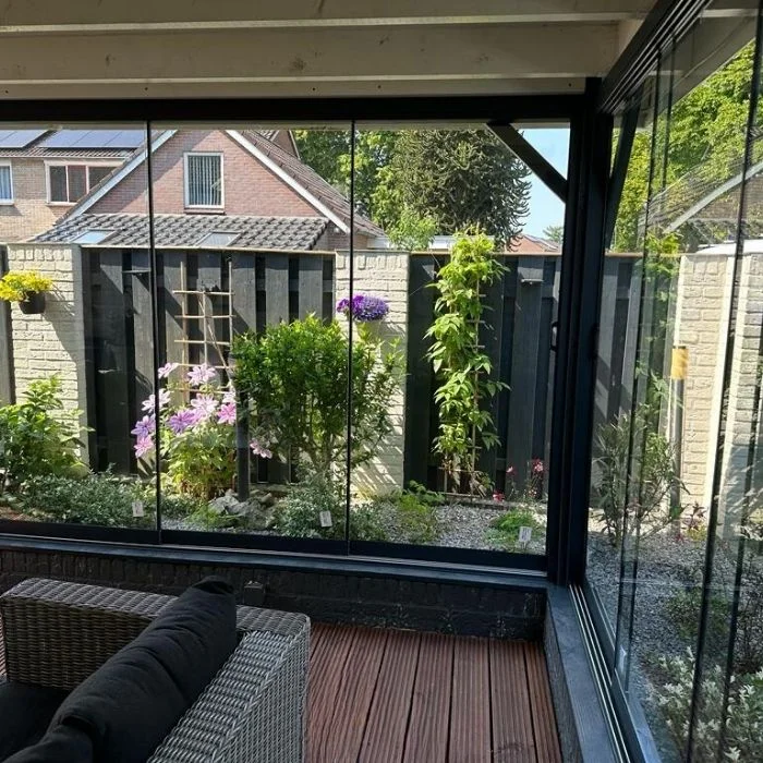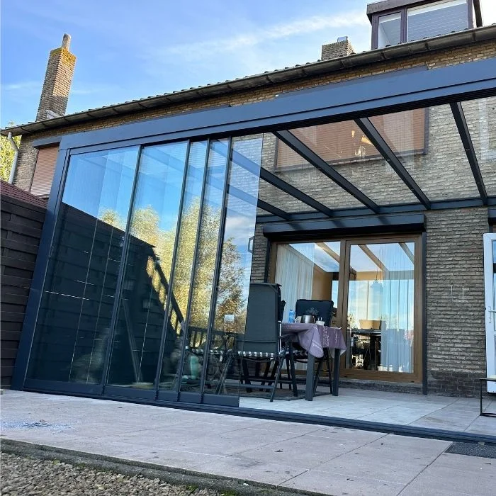 De glazen schuifwanden van de Vrede Veranda bestaan uit meerdere glazen schuifpanelen die eenvoudig geopend en gesloten kunnen worden door de handige schuifdeursysteem. Dankzij dit systeem kunt u uw veranda sluiten of openen wanneer u wilt. Dankzij de glazen schuifwanden van Vrede Veranda kunt u ook uw bestaande veranda, terras en overkapping omsluiten.